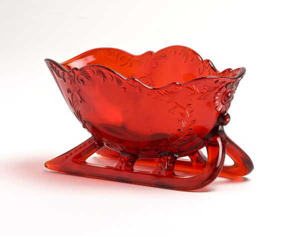 Mosser Glass Red Holiday Sleigh # 501RMosser's elegant Victorian style glass Sleigh makes an excellent Holiday or Christmas table centerpiece. Fill the glass Sleigh with candies, fresh baked mini cookies, trinkets, and more. Use the glass Sleigh in your holiday table centerpiece, or as an accent piece on your mantle or in a holiday display. Mosser's translucent Red Glass Sleigh measures 9" long x 6.5" deep x 8.5" high. Mosser's Red glass is made using a bit of gold for a great Red glass color. The Red Glass is a stunning table piece, standing out in any setting or decor. The craftsmen at Mosser Glass have been producing quality American Made Glassware since the 1950s. Mosser Glass produces high quality glassware made with fine craftsmanship. Each piece of Mosser Glass is hand blown and hand finished. Many pieces are made to order. Please allow 1-2 weeks for delivery. Proudly Made in the U.S.A.