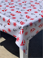 Nantucket in Blue Oil Cloth Fabric, Full Bolt of 12 Yards. Oilcloth yardage with a whimsical nautical look. Perfect for driving down the coast or taking a trip to the shore. With sailboats, anchors, and steering wheels aplenty.