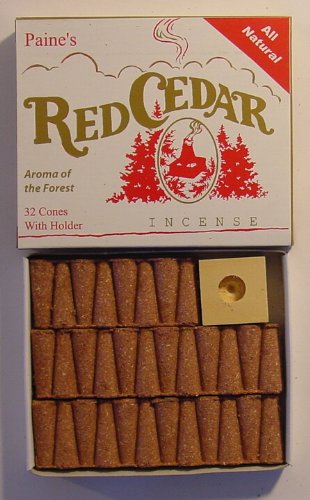 Paine's Products Red Cedar Incense Cones 32 cone shaped incense, measuring 1/4" tall with 1/2" base. Includes an incense burner for your Red Cedar scented cones.