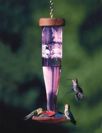 Our hummingbird lanterns feature a hand-lathed redwood base complete with brass accent ring containing three ruby anodized flowers. The bottle is beautiful art quality glass. This design is leak free and easy to clean and refill. 12" Tall, holds one pint. This item proudly made in the U.S.A.