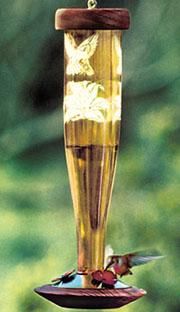 Our hummingbird lanterns feature a hand-lathed redwood base complete with brass accent ring containing three ruby anodized flowers. The bottle is beautiful art quality glass. This design is leak free and easy to clean and refill. 12" Tall, holds one pint. This item proudly made in the U.S.A.