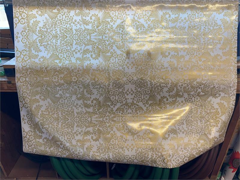 Paradise Lace Gold on White Oil Cloth, YardageOilcloth has been around for over a century and when it comes to making a bold color statement anywhere in your home. Oilcloth is a long-lasting, sturdy product that comes in vibrant colors. The oilcloth of yesteryear was resin-coated vinyl and the finish sometimes cracked or flaked. The new version is made of hi-tech plastic that won't crack but has the same colorful shine. Oilcloth has a mesh backing, which means it can really hold a stitch. It can be used for anything that needs to be durable and colorful--tablecloths, upholstered dining room chairs, curtains, bibs, lampshades, tissue boxes, outdoor chairs, etc. Your only limited by your imagination! Oil Cloth measures 48" wide & a full bolt equals 12 continuous yards (36 feet) Don't see the pattern or color you want? Please let us know and we will order it for you!