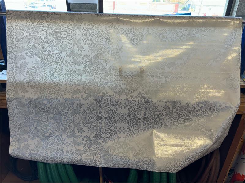 Paradise Lace Silver on White Oil Cloth, YardageOilcloth has been around for over a century and when it comes to making a bold color statement anywhere in your home. Oilcloth is a long-lasting, sturdy product that comes in vibrant colors. The oilcloth of yesteryear was resin-coated vinyl and the finish sometimes cracked or flaked. The new version is made of hi-tech plastic that won't crack but has the same colorful shine. Oilcloth has a mesh backing, which means it can really hold a stitch. It can be used for anything that needs to be durable and colorful--tablecloths, upholstered dining room chairs, curtains, bibs, lampshades, tissue boxes, outdoor chairs, etc. Your only limited by your imagination! Oil Cloth measures 48" wide & a full bolt equals 12 continuous yards (36 feet) Don't see the pattern or color you want? Please let us know and we will order it for you!
