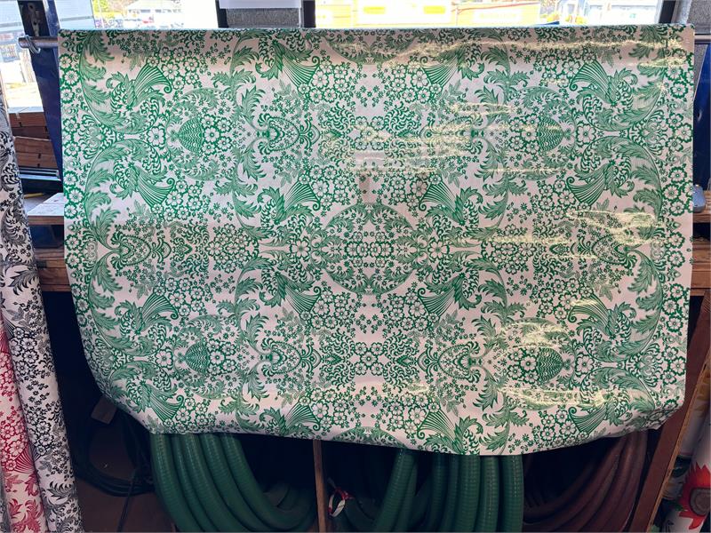 Paradise Lace Green on White Oil Cloth, Full BoltOilcloth has been around for over a century and when it comes to making a bold color statement anywhere in your home. Oilcloth is a long-lasting, sturdy product that comes in vibrant colors. The oilcloth of yesteryear was resin-coated vinyl and the finish sometimes cracked or flaked. The new version is made of hi-tech plastic that won't crack but has the same colorful shine. Oilcloth has a mesh backing, which means it can really hold a stitch. It can be used for anything that needs to be durable and colorful--tablecloths, upholstered dining room chairs, curtains, bibs, lampshades, tissue boxes, outdoor chairs, etc. Your only limited by your imagination! Oil Cloth measures 48" wide & a full bolt equals 12 continuous yards (36 feet) Don't see the pattern or color you want? Please let us know and we will order it for you!