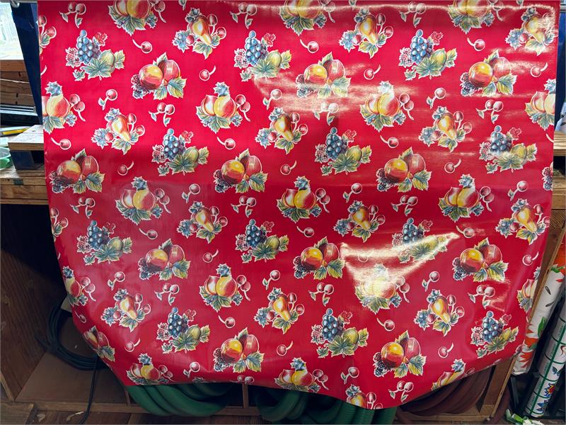 Pears and Apples on Red Oil Cloth, Full BoltOilcloth has been around for over a century and when it comes to making a bold color statement anywhere in your home. Oilcloth is a long-lasting, sturdy product that comes in vibrant colors. The oilcloth of yesteryear was resin-coated vinyl and the finish sometimes cracked or flaked. The new version is made of hi-tech plastic that won't crack but has the same colorful shine. Oilcloth has a mesh backing, which means it can really hold a stitch. It can be used for anything that needs to be durable and colorful--tablecloths, upholstered dining room chairs, curtains, bibs, lampshades, tissue boxes, outdoor chairs, etc. Your only limited by your imagination! Oil Cloth measures 48" wide & a full bolt equals 12 continuous yards (36 feet) Don't see the pattern or color you want? Please let us know and we will order it for you!