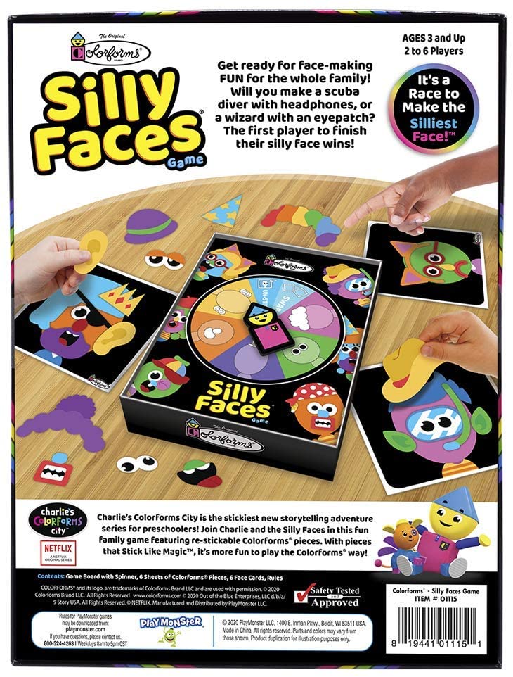 It’s a race to make the silliest face in this smile-filled classic game that sticks like magic! Spin the spinner and land on a face space to fill, then choose from a wacky assortment of re-stickable Colorforms pieces to stick on your face card. The first one to complete a whole silly face wins the game. Easy to learn and fun to play, it’s creative face-making fun for the whole family! Features characters from the new Netflix series Charlie’s Colorforms City. For 2 to 6 players.