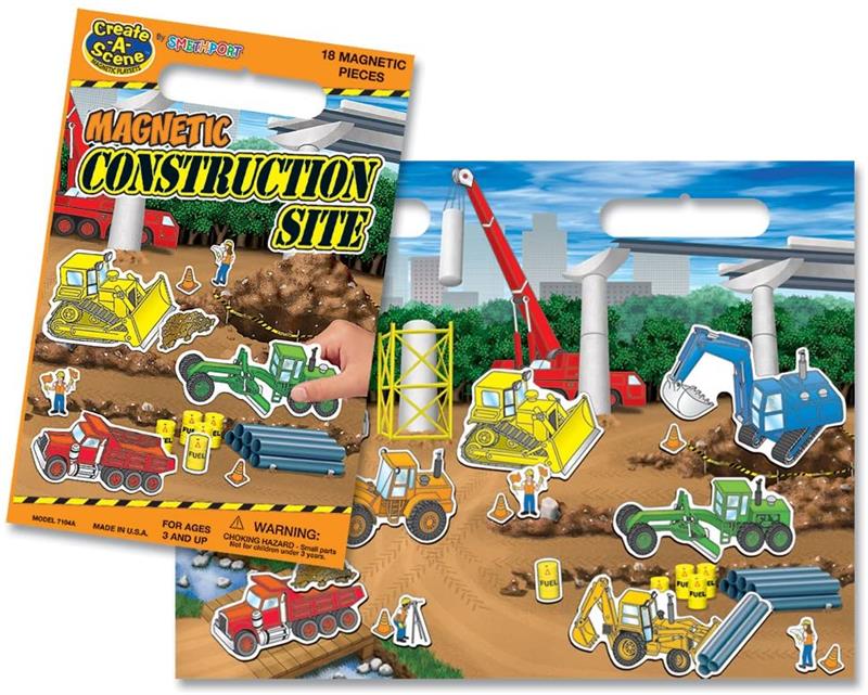 Playmonster Create-A-Scene Magnetic Construction Site Playset Toy Are you ready for some new scenery? Has the same old view got you down? Go on your own adventure with Create-A-Scene! Spend hours exploring new places and discovering new things! Use your imagination to craft a fantastical journey or just a simple everyday activity. The choice is yours when you play with Create-A-Scene! Create-A-Scene playsets feature large magnetic play-boards that fold in half for easy storage. And, with a clear, resilient coating, cleanup is a breeze! Kids will love the fun, while parents love the mess-free quiet playtime! Children will exercise their imaginations for hours with this magnetic playset that encourages storytelling, promote problem-solving skills, and build skills in sequencing. The 18" x 14" play board folds in half and is sealed with a clear, resilient coating to make cleanup easier. The vinyl, waterproof magnetic playing pieces provide extra hold. -