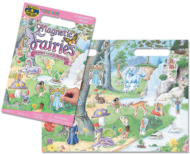 Playmonster Create-A-Scene Magnetic Faries Playset ToyAre you ready for some new scenery? Has the same old view got you down? Go on your own adventure with Create-A-Scene! Spend hours exploring new places and discovering new things! Use your imagination to craft a fantastical journey or just a simple everyday activity. The choice is yours when you play with Create-A-Scene! Create-A-Scene playsets feature large magnetic play-boards that fold in half for easy storage. And, with a clear, resilient coating, cleanup is a breeze! Kids will love the fun, while parents love the mess-free quiet playtime! Children will exercise their imaginations for hours with this magnetic playset that encourages storytelling, promote problem-solving skills, and build skills in sequencing. The 18" x 14" play board folds in half and is sealed with a clear, resilient coating to make cleanup easier. The vinyl, waterproof magnetic playing pieces provide extra hold. -