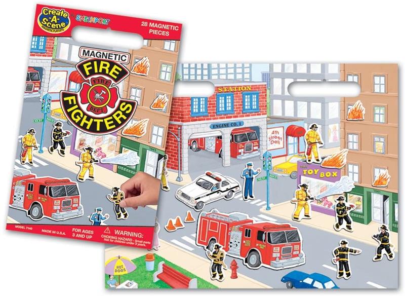 Playmonster Create-A-Scene Magnetic Fire Fighters Playset ToyAre you ready for some new scenery? Has the same old view got you down? Go on your own adventure with Create-A-Scene! Spend hours exploring new places and discovering new things! Use your imagination to craft a fantastical journey or just a simple everyday activity. The choice is yours when you play with Create-A-Scene! Create-A-Scene playsets feature large magnetic play-boards that fold in half for easy storage. And, with a clear, resilient coating, cleanup is a breeze! Kids will love the fun, while parents love the mess-free quiet playtime! Children will exercise their imaginations for hours with this magnetic playset that encourages storytelling, promote problem-solving skills, and build skills in sequencing. The 18" x 14" play board folds in half and is sealed with a clear, resilient coating to make cleanup easier. The vinyl, waterproof magnetic playing pieces provide extra hold. -