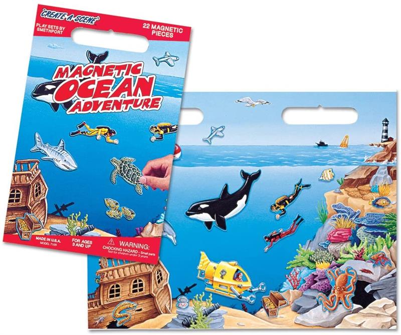 Playmonster Create-A-Scene Magnetic Ocean Adventure Playset ToyAre you ready for some new scenery? Has the same old view got you down? Go on your own adventure with Create-A-Scene! Spend hours exploring new places and discovering new things! Use your imagination to craft a fantastical journey or just a simple everyday activity. The choice is yours when you play with Create-A-Scene! Create-A-Scene playsets feature large magnetic play-boards that fold in half for easy storage. And, with a clear, resilient coating, cleanup is a breeze! Kids will love the fun, while parents love the mess-free quiet playtime! Children will exercise their imaginations for hours with this magnetic playset that encourages storytelling, promote problem-solving skills, and build skills in sequencing. The 18" x 14" play board folds in half and is sealed with a clear, resilient coating to make cleanup easier. The vinyl, waterproof magnetic playing pieces provide extra hold. -