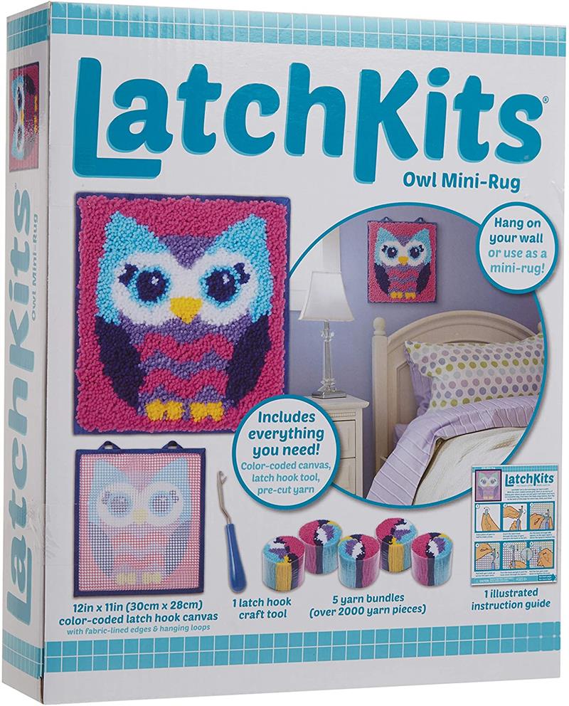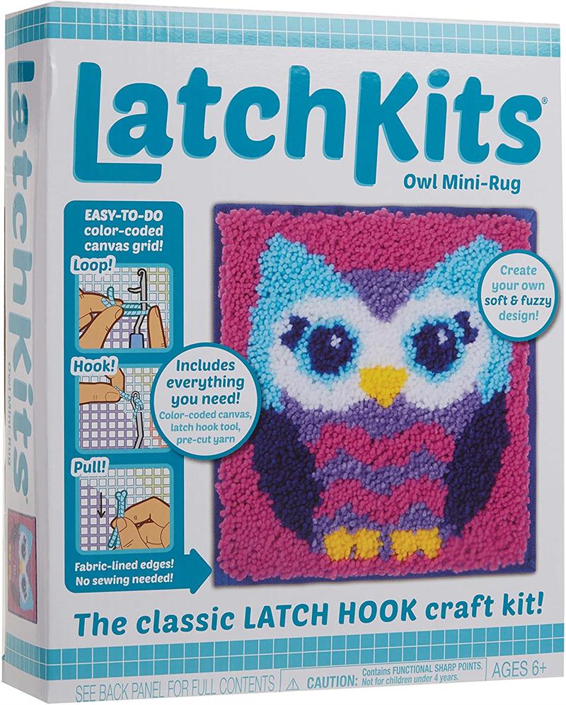 Latch Kits are a fun, easy-to-learn activity—just loop, hook, and pull! Includes everything to make your own mini masterpiece: One latch hook craft tool, five bundles of pre-cut yarn pieces, one color-coded canvas, and one illustrated instruction guide.