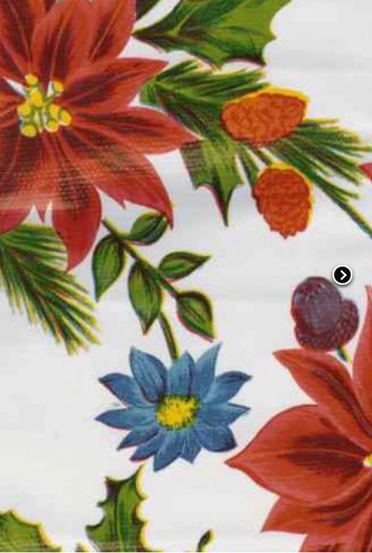 Poinsettia on Red Oil Cloth, Full Bolt of 12 Yards. Oilcloth yardage perfect for the holiday season. Bring in the good tidings and deck the halls with this classic poinsettia pattern. Complemented by pinecones, evergreen holly, and bold blooms.