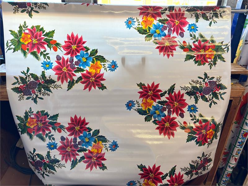 Sparkle Seasonal Oil Cloth, Full Bolt of 12 Yards. Oilcloth yardage perfect for the holiday season. Bring in the good tidings and deck the halls with this classic poinsettia pattern. Show off your holiday spirit year after year with this durable print