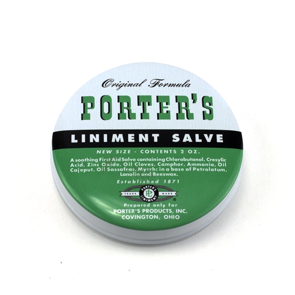 Porter's Salve is recommended as a "beneficial application for bruises, rough and cracked skin caused by inclement weather, insect bites, sunburn and local irritations," it is advocated for use on both man and beast alike. Porter's salve has a drawing quality, which works particularly well on slivers of metal, wood, or glass, beneath the surface of the skin.