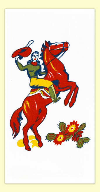 A fun, western themed towel featuring a 1950s Cowgirl on a rearing sorrel horse. Perfect for rodeo or western themed retro kitchens. Flour sack towel measures 17" x 24". 100% Cotton.