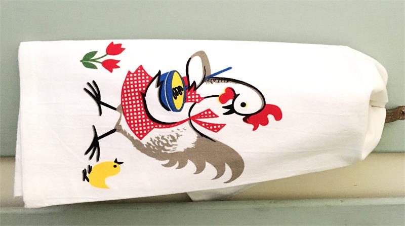Outspoken little hen and her proud husband! This vintage print of a country hen and her colorful rooster mate are sure to brighten up any country kitchen. 100% cotton flour sack towel measures 17" x 24". Brand New with Tags.