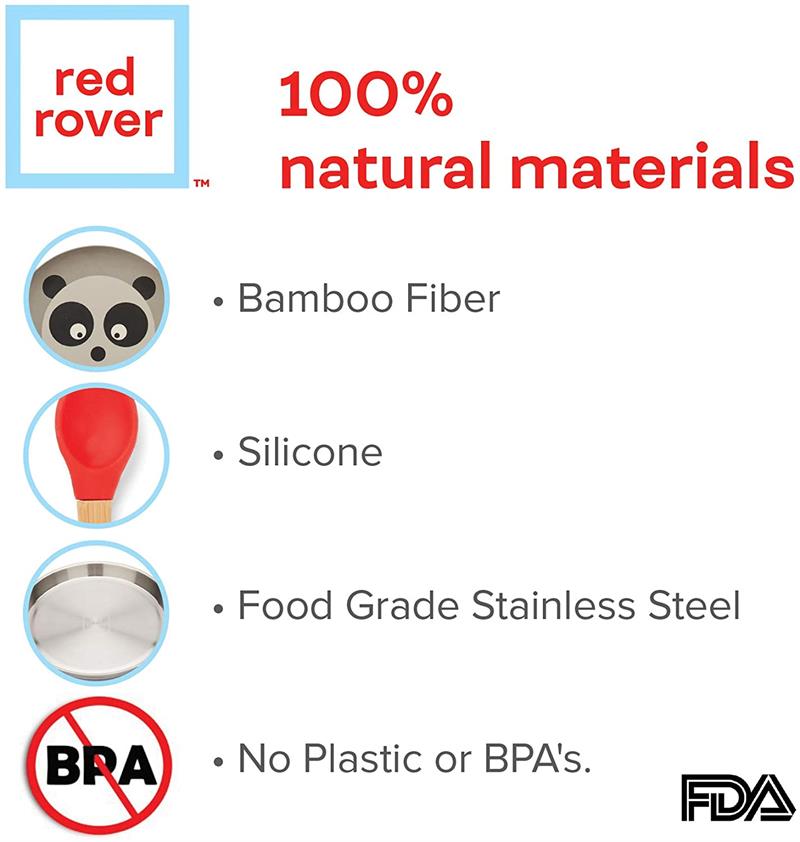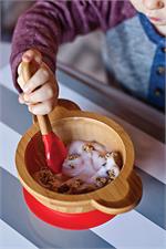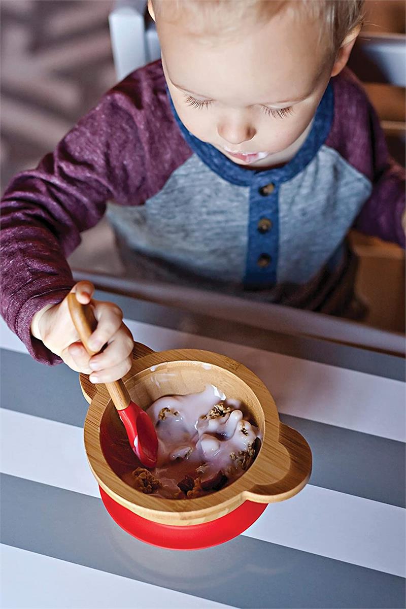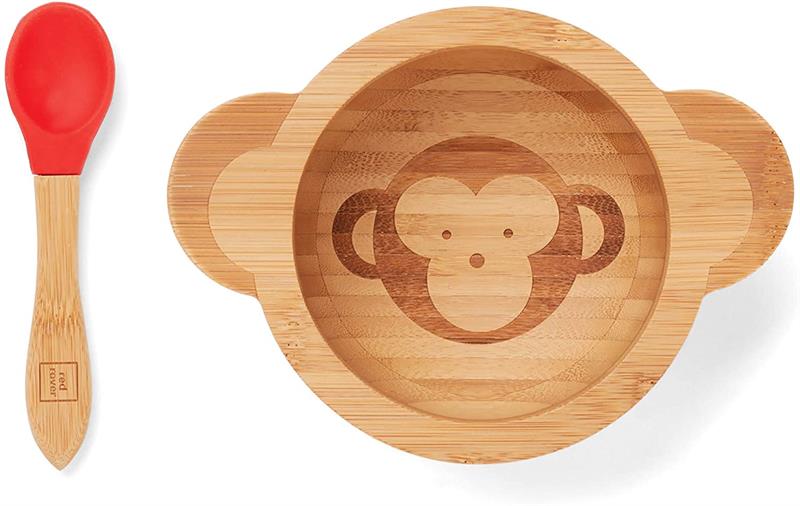 De-stress mealtime with Red Rover Bamboo Bowl and Spoon kid-friendly, mom-approved dinnerware! This set includes a kid-sized bowl and spoon, both constructed of sustainable materials, making them biodegradable and . Featuring an adorable animal design, The bowl is shaped as a monkey (its ears double as handles!), and, best of all, is equipped with a meal-saving suction cup base to prevent flipping, dumping, and throwing! Fussy babies and temper Tantrums don't stand a chance to this stay-put bowl. The bamboo fiber handles are ergonomic and easy to hold for both assisting parents and tiny toddler hands! Bright, cheerfully colored tip of spoon is made of soft silicone, which is safe and gentle enough for teething gums. Only the best for baby, These utensils are non-toxic and free of plastic, lead, and harmful chemicals. Make the transition to self-feeding painless, with less mess.