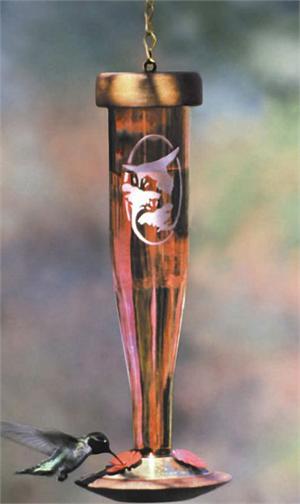 Our hummingbird lanterns feature a hand-lathed redwood base complete with brass accent ring containing three ruby anodized flowers. The bottle is beautiful art quality glass. This design is leak free and easy to clean and refill. 12" Tall, holds one pint. This item proudly made in the U.S.A.