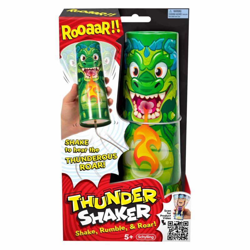 Shake, rumble and roar with Schylling’s Thunder Shaker; the incredible sound making toy. Simply shake the high quality metal cylinder in your hand and hear it come to life! The metal springs will dance and vibrate, creating rumbling, roaring, thunderous sounds. Available in 3 designs of Flaming Dragon, Roaring Yeti, or Thunder God. Design will be random, please let us choose. No batteries needed. CHOKING HAZARD—Small parts. Not for children under 3 yrs., Not suitable for children under 3 years.