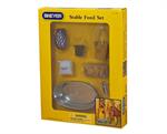 Finely-detailed boxed set includes aluminum water trough, hay bale and hay net, feed bucket, feedbag, bag of feed and feed scoop. Traditional Size Horse and barn not included.