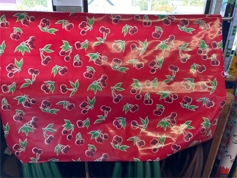 Stella Cherries on Red Oil Cloth, Full BoltOilcloth has been around for over a century and when it comes to making a bold color statement anywhere in your home. Oilcloth is a long-lasting, sturdy product that comes in vibrant colors. The oilcloth of yesteryear was resin-coated vinyl and the finish sometimes cracked or flaked. The new version is made of hi-tech plastic that won't crack but has the same colorful shine. Oilcloth has a mesh backing, which means it can really hold a stitch. It can be used for anything that needs to be durable and colorful--tablecloths, upholstered dining room chairs, curtains, bibs, lampshades, tissue boxes, outdoor chairs, etc. Your only limited by your imagination! Oil Cloth measures 48" wide & a full bolt equals 12 continuous yards (36 feet) Don't see the pattern or color you want? Please let us know and we will order it for you!