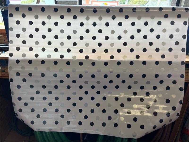 Tokyo Dots Black and Silver on White Oil Cloth, Yardage Oilcloth has been around for over a century and when it comes to making a bold color statement anywhere in your home. Oilcloth is a long-lasting, sturdy product that comes in vibrant colors. The oilcloth of yesteryear was resin-coated vinyl and the finish sometimes cracked or flaked. The new version is made of hi-tech plastic that won't crack but has the same colorful shine. Oilcloth has a mesh backing, which means it can really hold a stitch. It can be used for anything that needs to be durable and colorful--tablecloths, upholstered dining room chairs, curtains, bibs, lampshades, tissue boxes, outdoor chairs, etc. Your only limited by your imagination! Oil Cloth measures 48" wide & a full bolt equals 12 continuous yards (36 feet) Don't see the pattern or color you want? Please let us know and we will order it for you!
