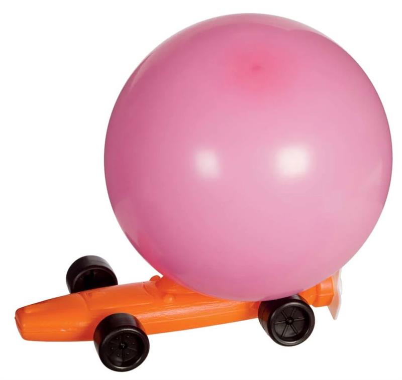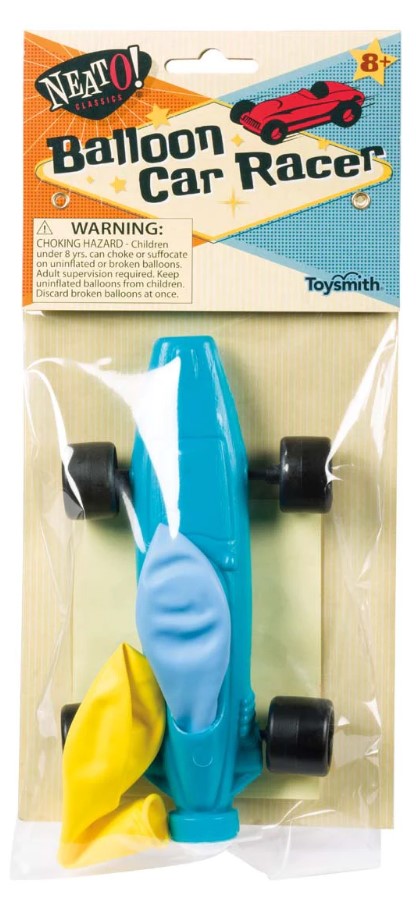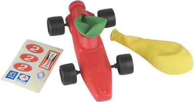 The Balloon Racers are colorful toy cars that have a balloon attached to the end of it. Balloon power is what makes this 6-inch car whistle and zoom! It makes a great propulsion principal toy. Includes two balloons and decals for decorating and plastic racer car. Please let us choose the color. Packaged in a polybag, this makes an excellent stocking stuffer or fun classroom toy.
