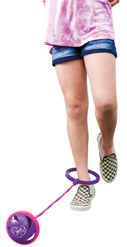 The Skip-A-Long toy from Playground Classics is a classic outdoor skip ball. Includes 1 plastic skip ball attached to an ankle loop with a short skip cord. Available in 3 assorted color combinations including purple and pink, green and purple, or pink and green. Please let us choose the color. The skip cord also features a twisting design with both colors. All pieces are sturdily constructed with highly durable plastic materials for long-lasting use.