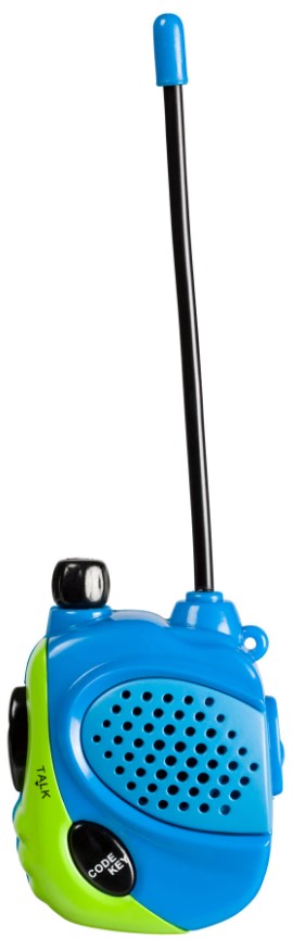 This set of 2 mini walkie-talkies from Outdoor Discovery is a miniature fun-sized version of the Outdoor Discovery Walkie Talkies. The Mini Walkie Talkies include 2 battery-powered compact walkie-talkies, each with 2 transistors, a flexible antenna, and a press-to-talk function and volume control. Packaged in a peggable plastic packet. Each walkie-talkie stands 2.5 inches tall, is brightly colored in blue, green, and black, and can communicate up to 200 feet.