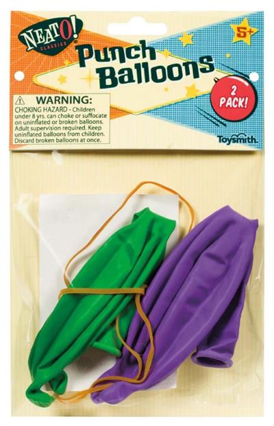 These colorful punch balloons inflate to 16 inches. Random colors. Two latex balloons per bag. For ages 5yrs and up. Made of natural latex rubber.