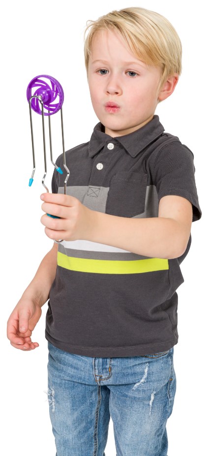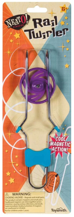 Cool magnetic action makes the 2 inches wheel spin around and around on the 9 inches metal rail. Place the magnetic wheel on the rail and tip the rail upward to begin the twirling action! Continue moving the rail up and down to keep the magnetic wheel twirling. Mesmerizing! For ages 5yrs and up.