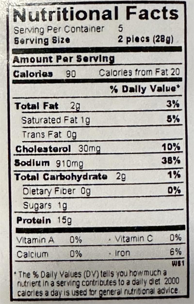 Ingrediants Beef, Hydrolyzed Vegetable Protein (water, hydrolyzed soy protein, salt) Brown Sugar, Sea Salt, Corn Syrup Solids, White Vinegar, Natural Smoke Flavoring, Spice, Garlic, Maltodextrin, Bromelain, Papain, Sodium Nitrite