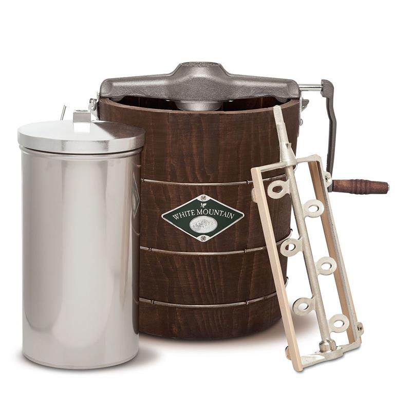 Made in classic American style, this ice cream bucket is handcrafted of sturdy New England white pine by the 150 year old White Mountain Company. This ice cream maker turns out ultrasmooth old-fashioned ice cream or frozen yogurt in 20 to 40 minutes. Triple motion action dasher system, heavy-duty hand crank, stainless steel canister and lid. Bucket is bound by strong galvanized hoops for durability. Recipes included.