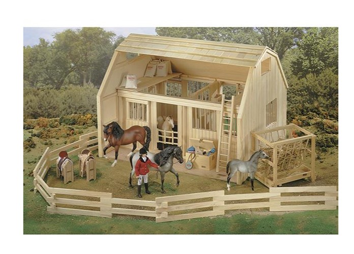 The deluxe barn fits up to two Traditional Series horses. Includes two stalls with mats and built-in feed bins, sliding doors, hay loft, saddle and bridle rack and cross tie area. Made of natural wood.