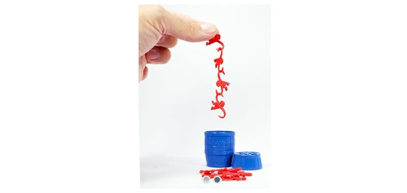 The classic game Barrel of Monkeys first released in 1965 is now available in the world’s smallest size ever! Just like the original Barrel of Monkeys game, this tiny game is a barrel of fun! When players throw their monkeys out on a table, their arms and tails are tangled up together. The challenge is to pick up one monkey and then pick up another monkey by the first monkey’s arm, then continue to make a monkey chain. Be careful…dropping a monkey means that turn is over! The first player to hook together all 10 monkeys wins! For one or more players. Ages 6+