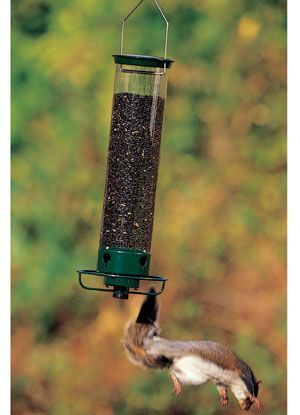 The seed tube is generous in height, making it impossible for squirrels to hang down from the top and reach seed. The four feeding ports are easily accessible via the perch ring, and the interior of the chamber is designed to direct seed into the seed ports. Birds will not set it off, not even larger species like Woodpeckers and Cardinals. But the minute a squirrel hops on to the perch, the motor is triggered and the feeder begins spinning, taking the squirrel for a whirl before it loses its grip and is thrown gently from the perch. The heavy metal cap fits snugly on the tube to prevent squirrels from lifting it to reach the seed. The clear feeder tube makes the seed visible to the birds, a proven advantage. Made of UV Stabilized Polycarbonate, it ensures long lasting durability without yellowing, Its length and girth are designed to prevent squirrels from reaching the seed ports. With a large 5 lb. capacity, you don't need to refill your feeder every day. An internal baffle design keeps seed flowing freely to the ports. With the metal top and base powder coated in Forest Green, the Flipper looks great in any yard. Hang the Flipper securely from its heavy duty signature looped stainless steel wire which reduces motion. Components made in the U.S.A. and in China. Lifetime Warranty against squirrel damage in the feeder; one year Limited Warranty on electronics. Components made in the U.S.A and in China. Now the birds can eat without disruption, and your family will get a kick out of watching squirrels go for their rides.